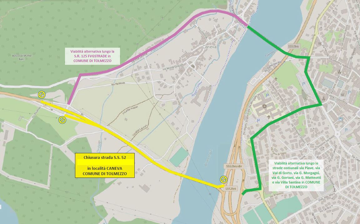 Friuli Venezia Giulia strade comunica che, lungo la S.S. 52 “Carnica” al km. 13+750 in Comune di Tolmezzo in località Caneva dalle ore 23:00 del 14/01/2021 alle ore 01:00 del 15/01/2021, venga interdetta temporaneamente la circolazione nei due sensi di marcia con deviazione di itinerario in loco lungo la S.R. UD 125 “del Sasso Tagliato” e su viabilità comunale, così come meglio evidenziato nelle planimetrie allegate.