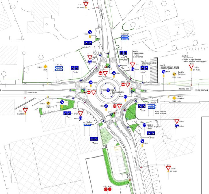 La nuova rotatoria, del diametro di 36 metri, sarà dotata di marciapiedi, fatta eccezione per il solo tratto per Susans posto sul ciglio destro di via Cimano, protetti dal traffico veicolare da aiuole verdi della larghezza di 1 metro. L’intervento migliorerà la situazione esistente degli accessi privati, anche commerciali, allontanando le aree di manovra (ingresso e uscita dagli stessi) dall’area della rotatoria. L’anello perimetrale dell’isola centrale della rotatoria, della larghezza di 3 metri, consentirà l’attraversamento dell’intersezione anche ai trasporti eccezionali. Contestualmente all’intervento viario, verrà anche rifatto il nuovo assetto del sistema di raccolta delle acque meteoriche mediante caditoie poste lungo il ciglio della strada e nuovi collettori di smaltimento. Il progetto prevede, infine, la realizzazione di un nuovo impianto d’illuminazione pubblica previa rimozione dell’esistente.
