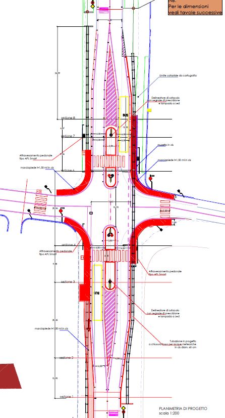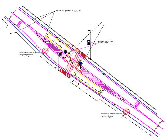 L’intervento consiste principalmente nella realizzazione di due attraversamenti con aiuole spartitraffico collocate in mezzo alla carreggiata che avranno il compito di mettere in sicurezza l’attraversamento dei pedoni, ma anche di rallentare la velocità dei veicoli in transito. Per questo motivo dal punto di vista tecnico i due attraversamenti prevedono delle aiuole spartitraffico con particolari misure per obbligare gli automobilisti a rallentare. La segnaletica orizzontale e verticale sarà ben evidente ed integrata ad un impianto di illuminazione di nuova generazione che migliorerà la visibilità del pedone.