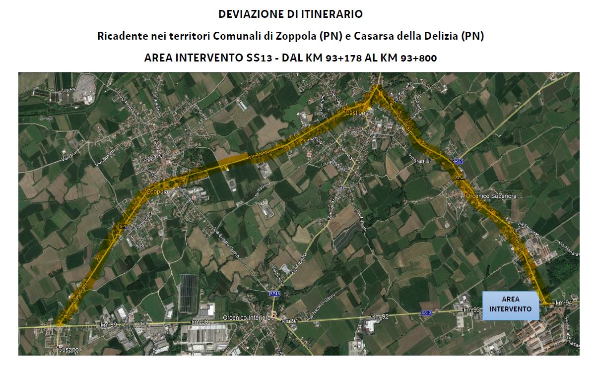 A causa di un importante intervento di asfaltatura dal km 93+178 al km 93+800 nei comuni di Casarsa della Delizia e Zoppola, la SS 13 Pontebbana rimarrà chiusa dalle ore 20.00 di venerdì 2 luglio alle ore 24.00 di domenica 4 luglio 2021. I lavori, eseguiti in continuità h24, prevedono prima il rifacimento della fondazione stradale per poi eseguire la messa in pristino del piano viabile mediante conglomerato bituminoso.