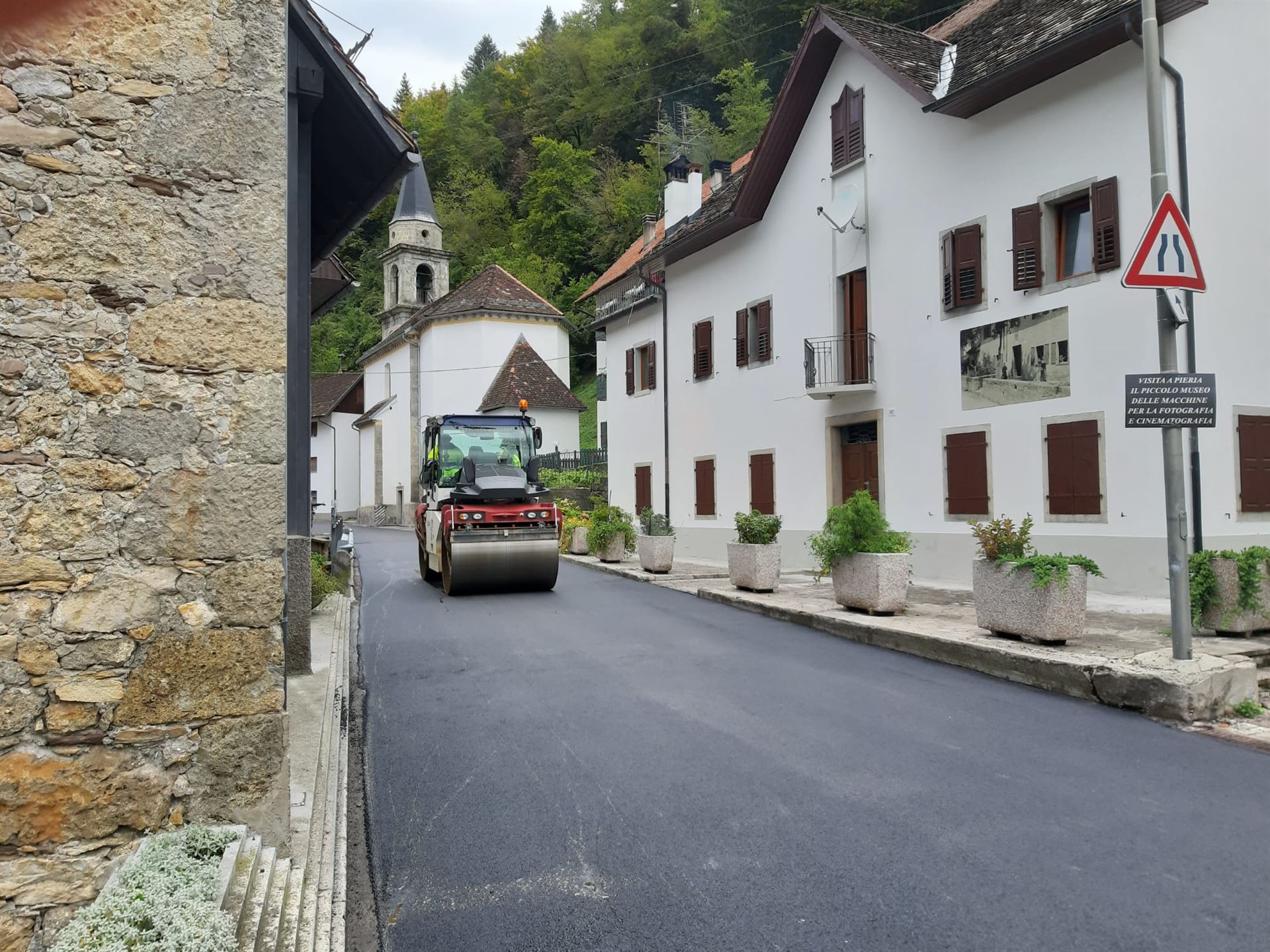 Ieri, infatti, FVG Strade e la R.T.I. composta dalle ditte A.E.B. Costruzioni Generali S.r.l., AB Global Service S.r.l. e L.T.R. Asphalt S.r.l hanno eseguito la nuova asfaltatura su un tratto della SR 465 nel centro abitato di Pieria, sfiorando le case e i muri del piccolo centro montano friulano.