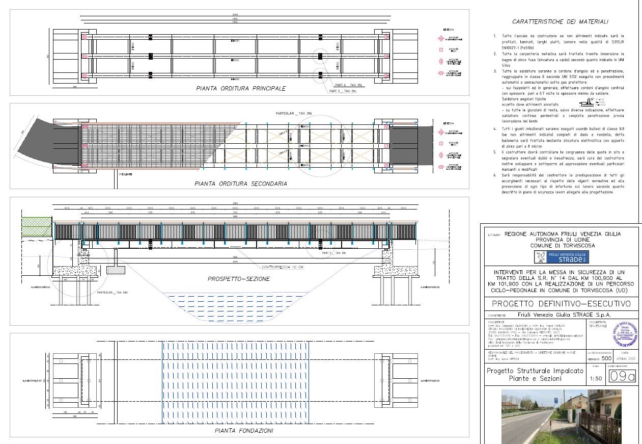Il manufatto metallico, lungo 20 metri e largo 3 possiede spalle fondate su pali. L’opera si colloca all’interno dello spazio tra la SS 14 e la linea ferroviaria Venezia Trieste affiancandole. I lavori sono eseguiti dalla Impresa Polese Srl e sono seguiti per FVG Strade dall’ing. Luca Vittori.