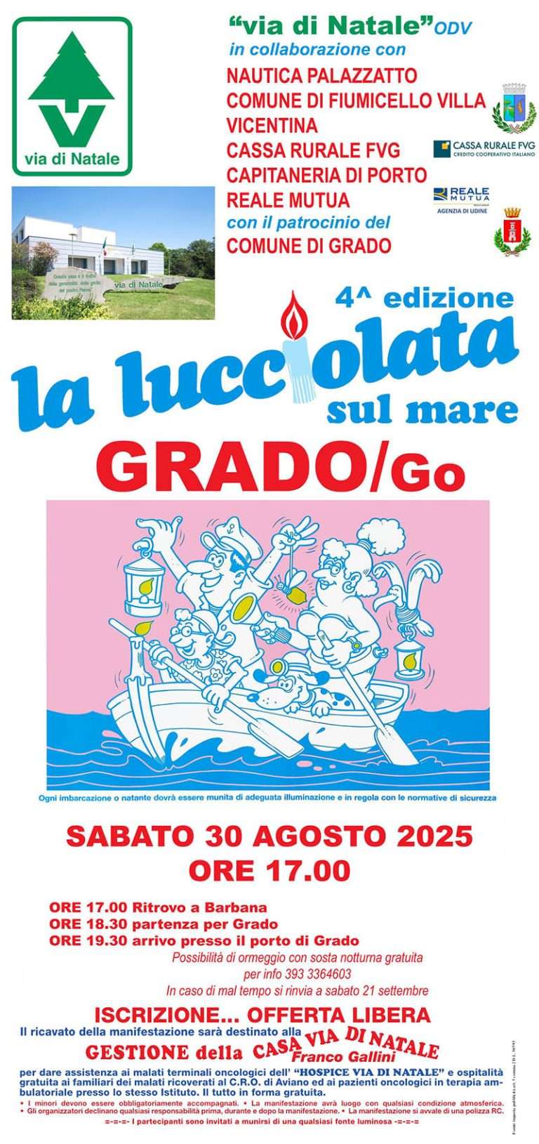 Sabato 30 agosto si terrà la manifestazione nautica “La Lucciolata sul Mare 2025”, che comporterà l’apertura del Ponte girevole “G. Matteotti” al Km 40+207 della Strada Regionale n. 352 “di Grado” per circa 20 minuti (indicativamente dalle 19:30 alle 19:50).