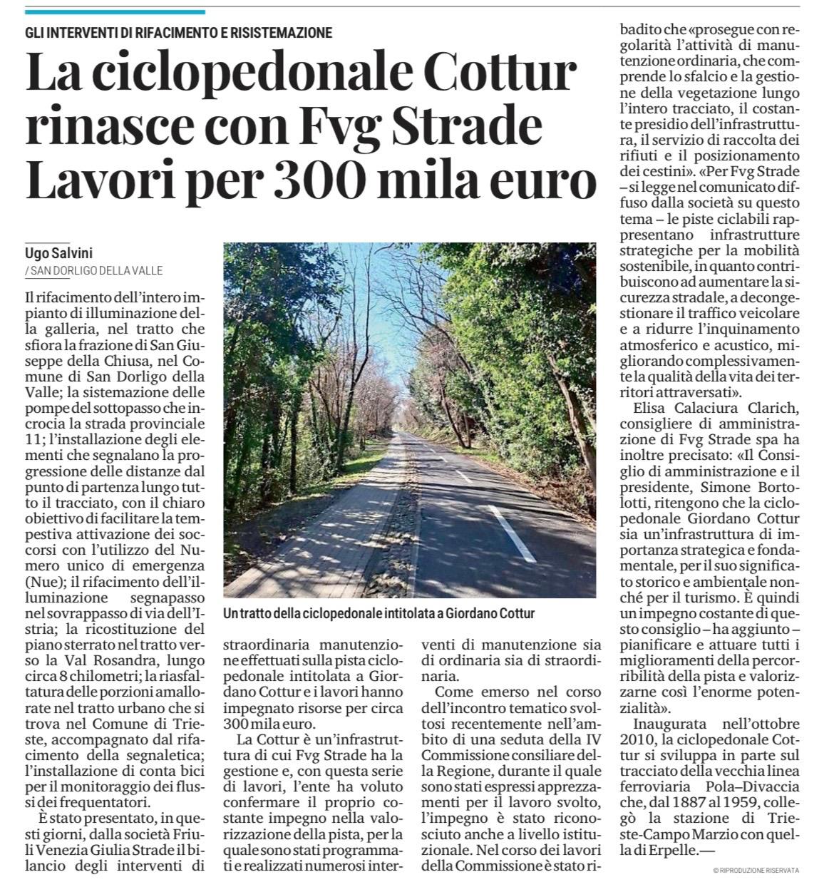 Friuli Venezia Giulia Strade sta investendo e ha investito molto sulla ciclabile “G. Cottur” da quando ne è diventata gestore, con molteplici interventi di natura ordinaria e straordinaria, ricevendo diversi apprezzamenti per quanto fatto, di cui l’ultimo durante l’incontro tematico svoltosi in Regione il giorno 22 gennaio 2026 presso la IV commissione consiliare.